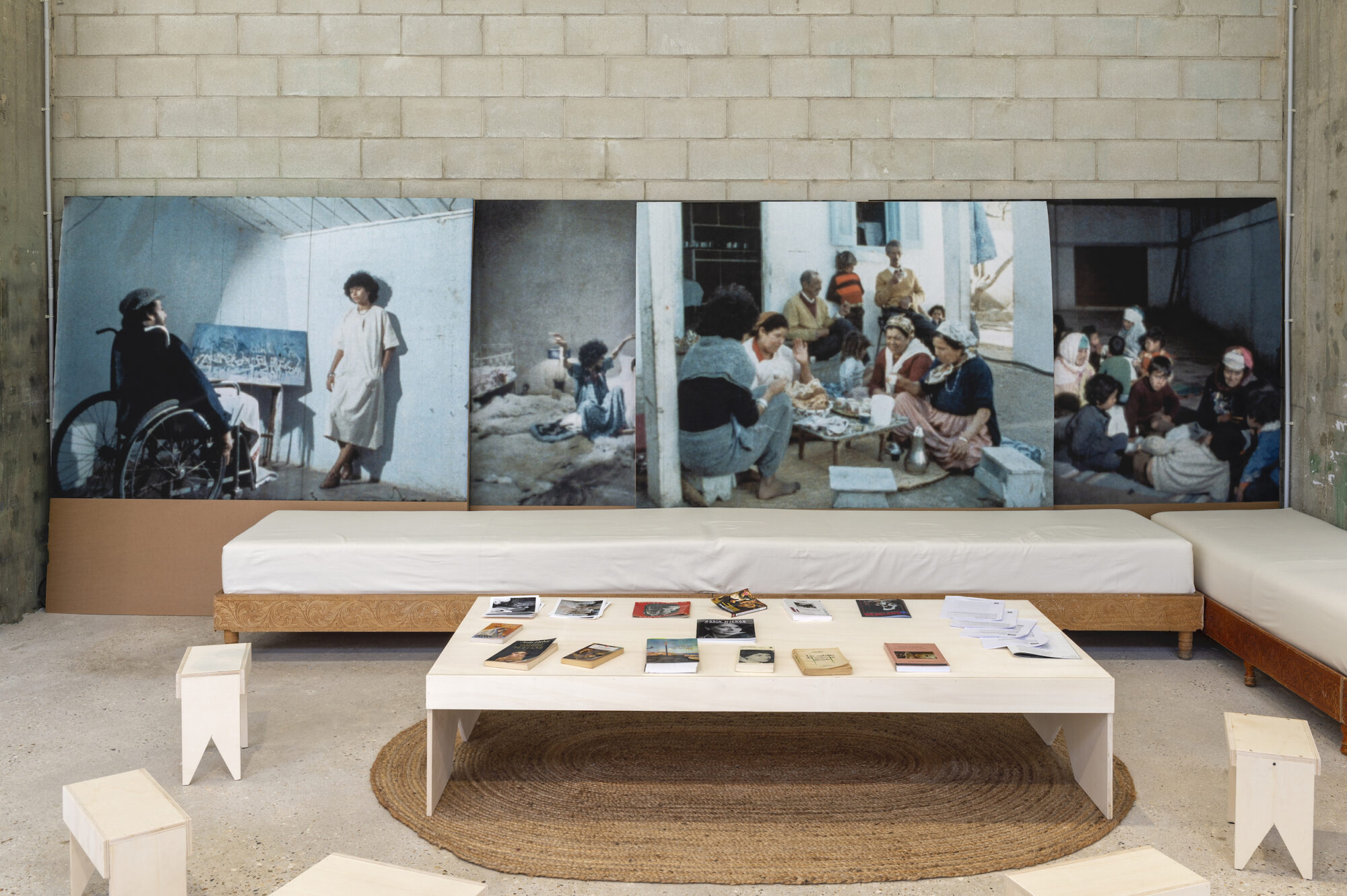 Éléments de scénographie pour le chapitre 4 du “Roman algérien”, impressions de photogrammes du film d’Assia Djebar “La nouba des femmes du mont Chenoua” (1977) et de photographies de tournage par Julien Graux, ouvrages et documents de et sur Assia Djebar