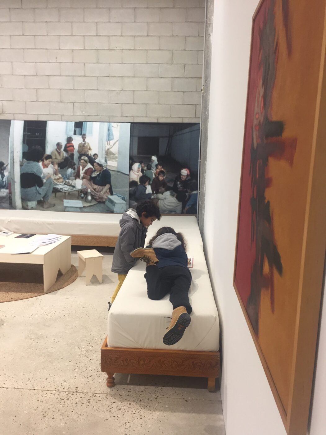 Camille, 5 ans, en montrant du doigt les sculptures-lits de Konstantinos Kyriakopoulos dans l’exposition « Un·Tuning Together » – septembre/décembre 2023